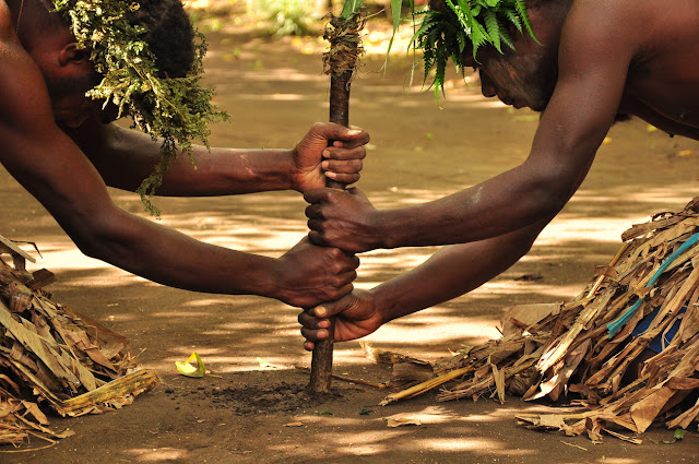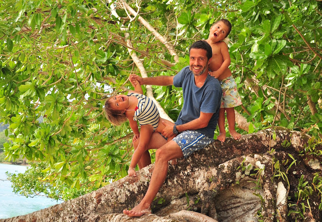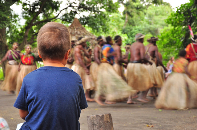 We flew into Tanna just knowing we wanted to go to Mount Yasur, the volcano, we didn't even read much about it. When we got there we saw that the minimum age recommendation was 7 years so we hesitated but we decided to go anyway. They take you to a village at the bottom of the volcano, a 1h30 driving on a bumpy unsealed road, from where we were staying. Not a very comfortable journey, specially because they drive too fast for the quality of the road and you have to hold tight all the way, more if you have 2 little kids to hold. Once you get to the village they seat you in a "row" and the local people come and do some dances and the 'big chief' to bless our volcano trip. We were seated and when they finished dancing Francisco kept asking why we couldn't go and still had to be seated there. We told him that the chief of the tribe had to authorise it and turned around. When we looked Francisco was talking to the chief, he went there by himself and asked permission to go up and screamed to everyone “He said yes!”. Everyone laughed! We jumped into pickup trucks and off we went to the volcano, through the middle of the jungle with no roads at all, going up among rocks. They leave you very close to the crater so it was an easy walk up, even for the kids.